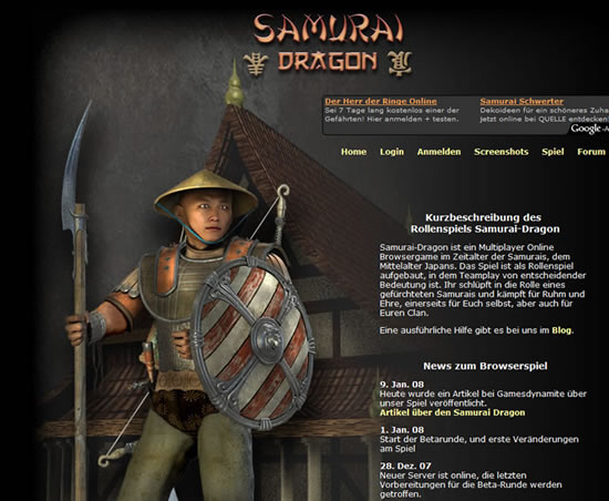 Werde im japanischen Mittelalter der ruhmvollste Samurai seiner Zeit! Samurai Dragon ist ein Multiplayer Browser Spiel, in dem es auf Strategie und Teamplay ankommt. Du kannst Dich einem Clan anschließen oder selbst einen gründen, um gemeinsam gegen andere Clans anzutreten, sie auszurauben und zu plündern! So sicherst Du Dir die Goldvorräte Deiner Feinde und kannst beim Schmied oder Bogenbauer noch bessere Waffen einkaufen. Zuvor musst Du Deinen Samurai trainieren, bis er ausgefeilte Kampftechniken beherrscht. Fordere einen anderen Samurai heraus und beweise Dein Können. Denke daran, ein Kampf ist für Deinen Samurai anstrengend und er muss sich erst zu Hause oder bei einem teuren Alchimisten regenerieren. Auf dem Marktplatz der Samurais kannst Du Deine alten Waffen verkaufen und günstig neue von Mitspielern erwerben. Trete in Kontakt mit den anderen Online Spielern per Chat. Erlebe die Welt der alten Samurais mit Samurai Dragon kostenlos und mache Dich auf zum erfolgreichsten Samurai aller Zeiten!